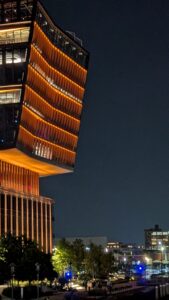 The inverted frustum sits atop a brick podium delineated by pilasters. To visually homogenize the two elements, the pilasters are uplit with individual grazers, creating an upward flow that strengthens the podium cage to visually support the upper ingot.
