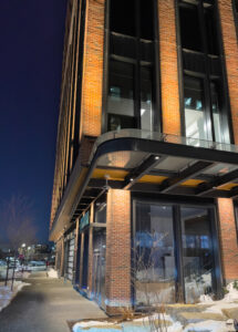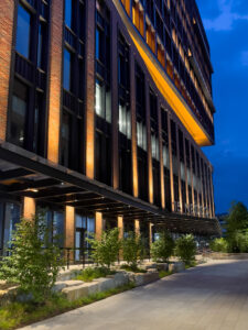 The gesture of lighting the warm wood extends throughout the facade into the brows projected from each floor. Acknowledging potential sightlines into the fixtures from the interior spaces, fixture locations were calibrated in addition to glare-control louvers and careful aiming.