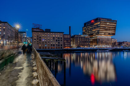The lighting design at 225 Wyman Street in Waltham, Massachusetts, plays a pivotal role in enhancing both the building’s aesthetic appeal and its functional environment. The design incorporates floor-to-ceiling windows that allow abundant natural light to permeate deep into the office and lab spaces, creating a bright and inviting atmosphere conducive to productivity. In the evenings, the building’s exterior is illuminated to highlight its architectural features, including the distinctive tensile curtain wall in the main foyer.