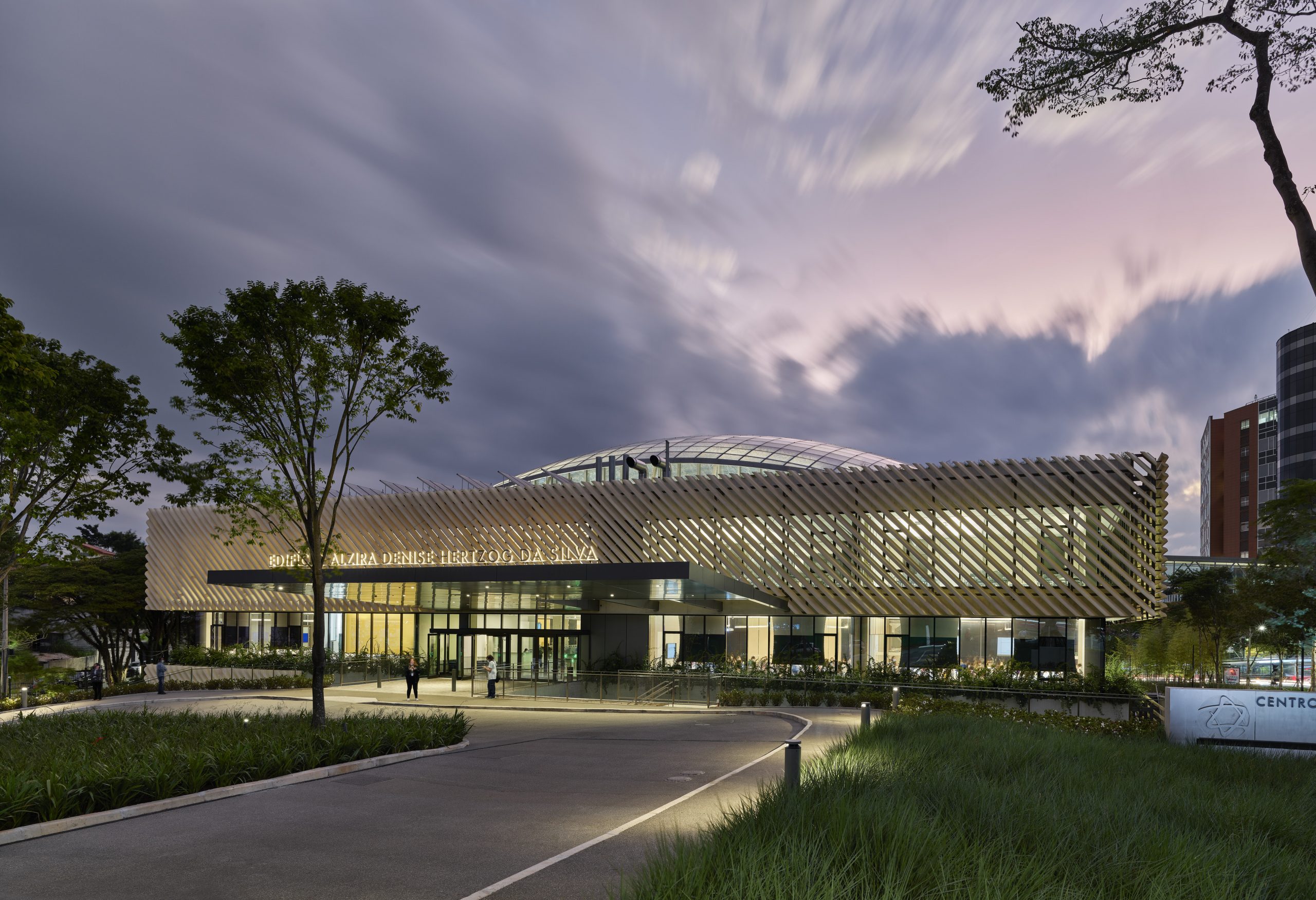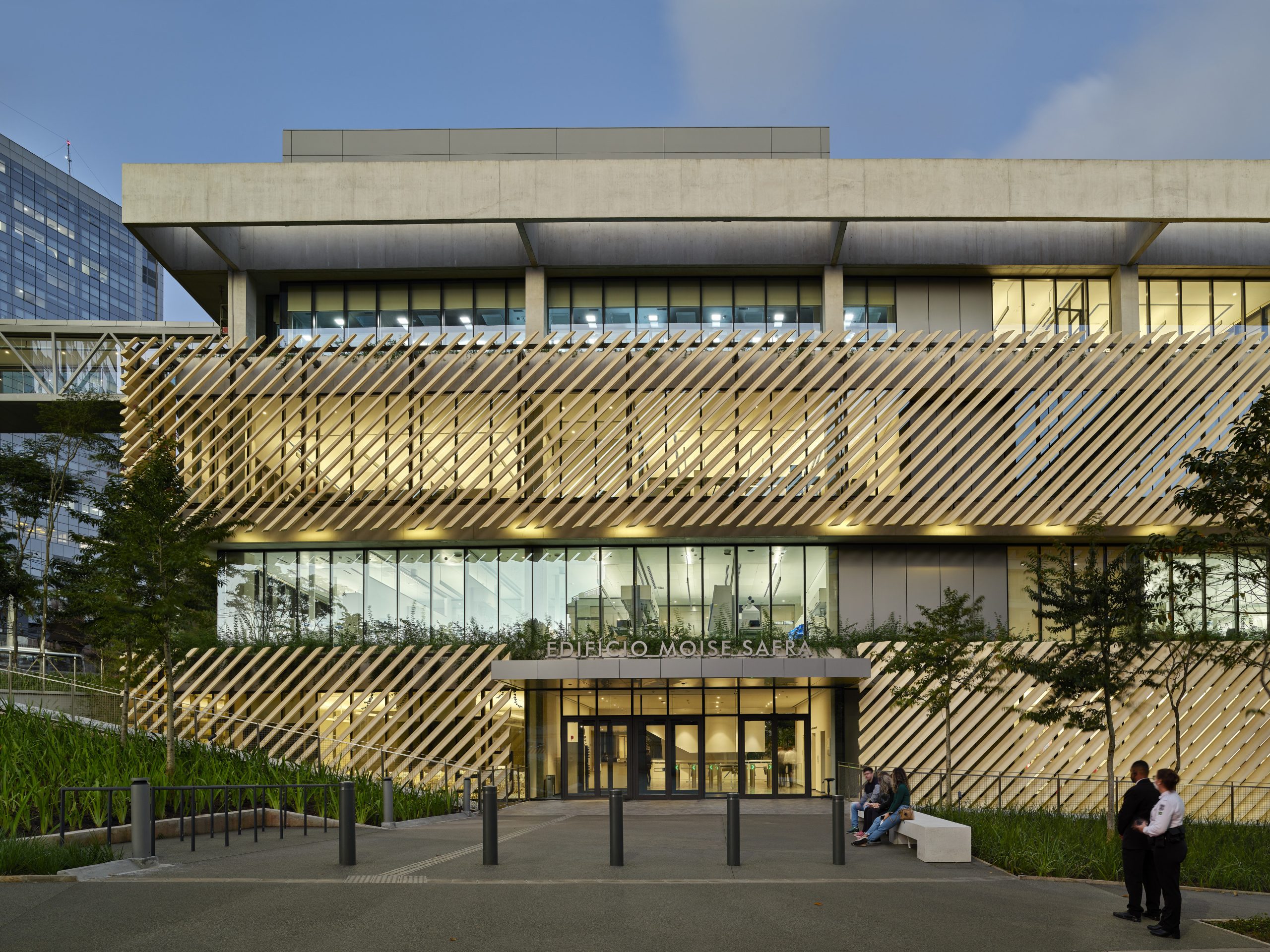 The Albert Einstein Education and Research Center in São Paulo, Brazil is a landmark medical teaching environment that brings together classrooms, labs, study areas, and student interaction areas in a lush garden setting. The landscaped site flows through the building to a huge central daylight atrium, around which the spaces are organized.