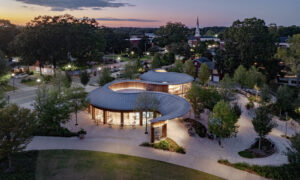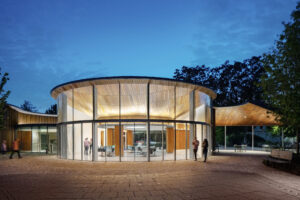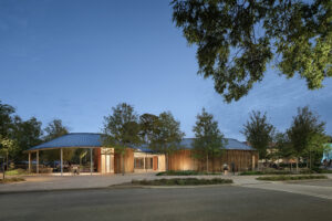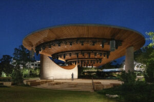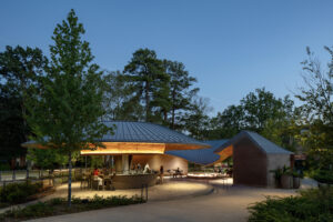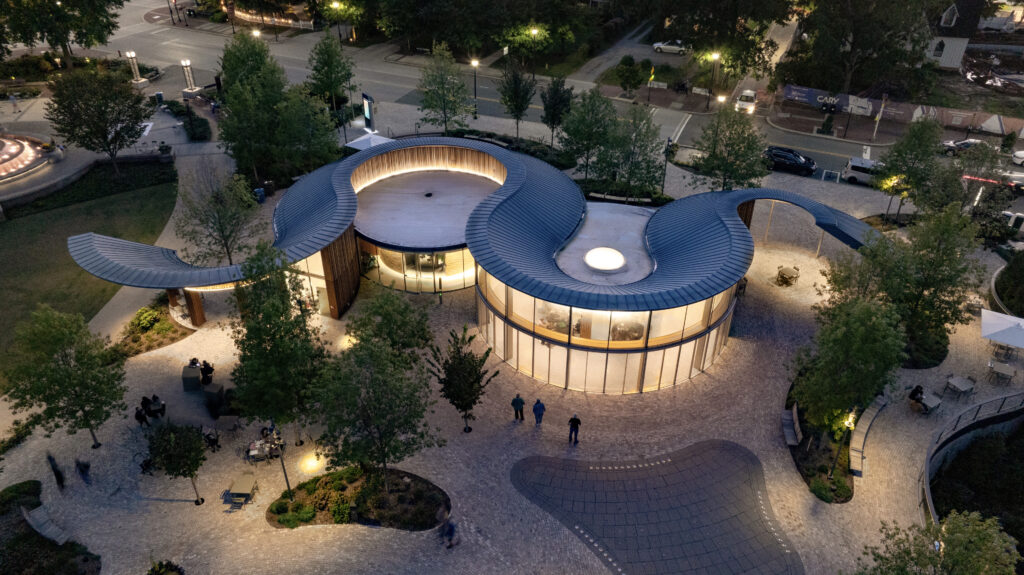 Organized as a sequence of outdoor “rooms,” the park connects meandering paths, elevated walkways, water and art features, and diverse botanical environments celebrating North Carolina’s native ecology. Active and passive spaces—from the great lawn and interactive play areas to quiet gardens—create a flexible framework for daily use and large civic gatherings. The Architect’s signature pavilions, composed of wood, stone, and metal with inverted conic roof forms, act as luminous anchors that blur interior and exterior boundaries while supporting performances, dining, and leisure.