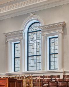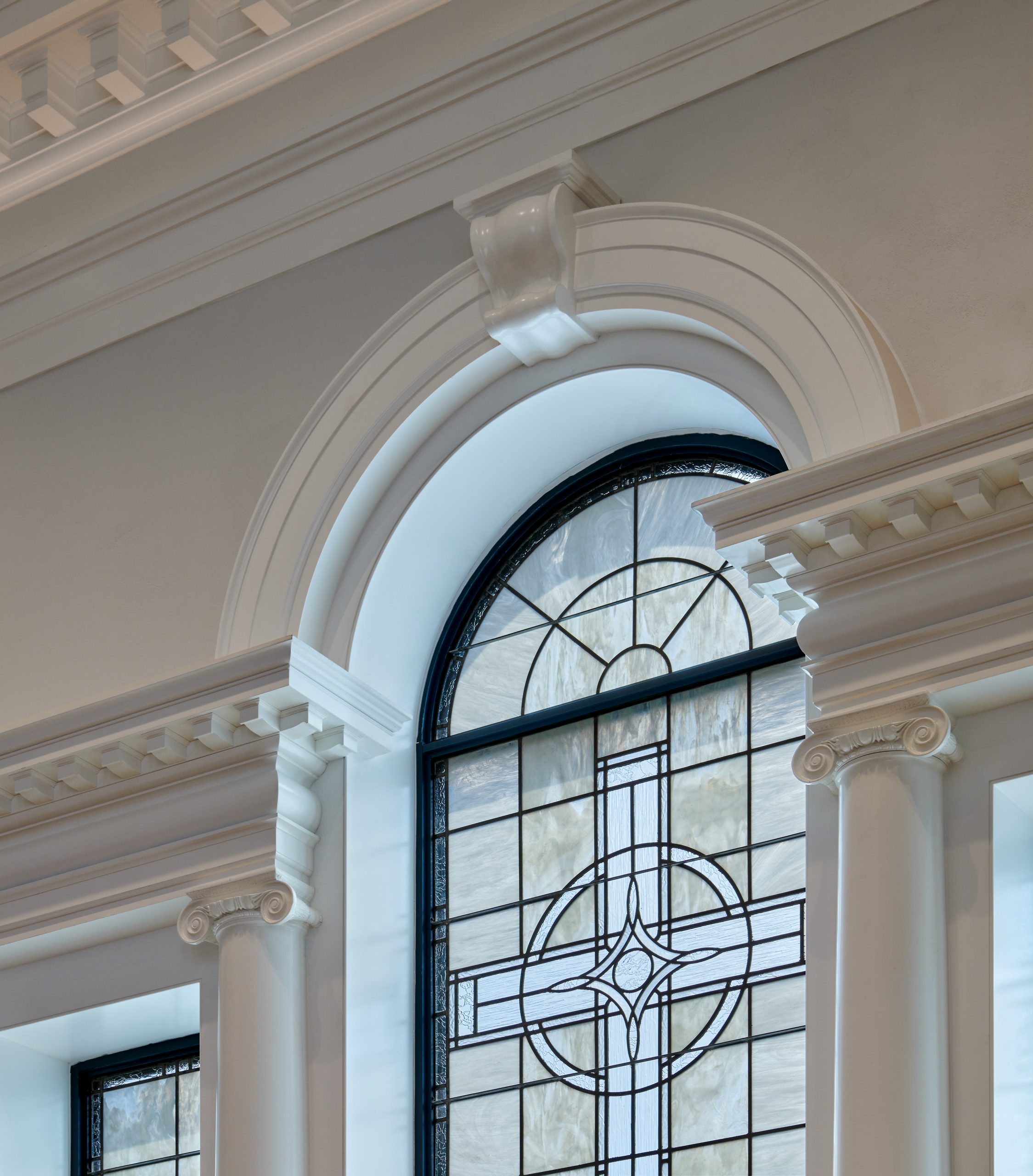 A newly conceived Palladian window replaces the original arched stained-glass window, designed with careful tinting to filter harsh sunlight while maintaining comfort and aesthetic appeal throughout the day. Digital and physical modeling informed its design, ensuring optimal daylight control. Additionally, a sophisticated dimming control system conserves energy and allows for pre-set scenes tailored to different times of the day and special events. The result is an inviting, visually rich, and spiritually uplifting worship environment that fosters comfort and connection, providing the community with an inspiring space for reflection and transformation.