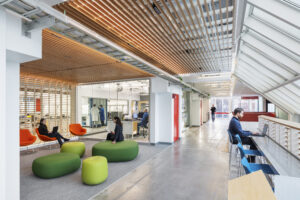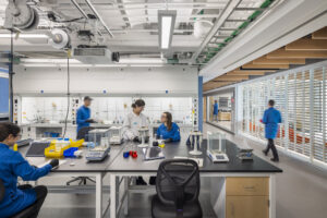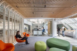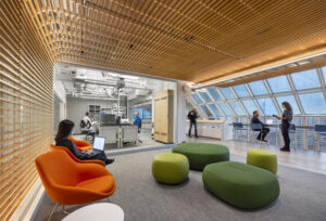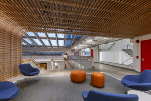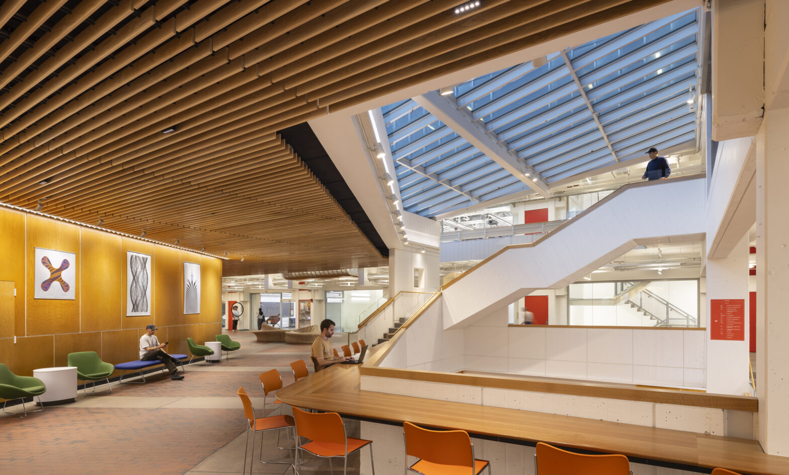 To bring the scale down in the lobby and lounges, wooden slats wrap the ceilings to create a warm scrim that hides the mechanical layer above. Lighting is concealed within architectural details, and downlights with glare-control louvers blend into the ceiling so that only the texture and warmth of the wood is perceived—not the light source itself. The architecture is revealed through the “silence” of light. In labs, classrooms, and offices, the renovation maintains the original intent of showcasing infrastructure, with exposed direct-indirect fixtures, wall washers, and monopoints forming a cohesive ceiling datum. Rather than hiding the mechanical layer, the ceilings are upllit and celebrated, reinforcing brightness throughout the teaching and research spaces.