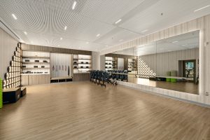 The newly renovated space boasts an array of conference and event rooms, open seating areas, breakout spaces, and a fitness center, culminating in a rooftop deck for relaxation and fitness activities. Central to the project’s success is the installation of custom freeform Turf ceiling baffles, which, alongside lighting fixtures reminiscent of boat sails, play a pivotal role in achieving the design vision.
